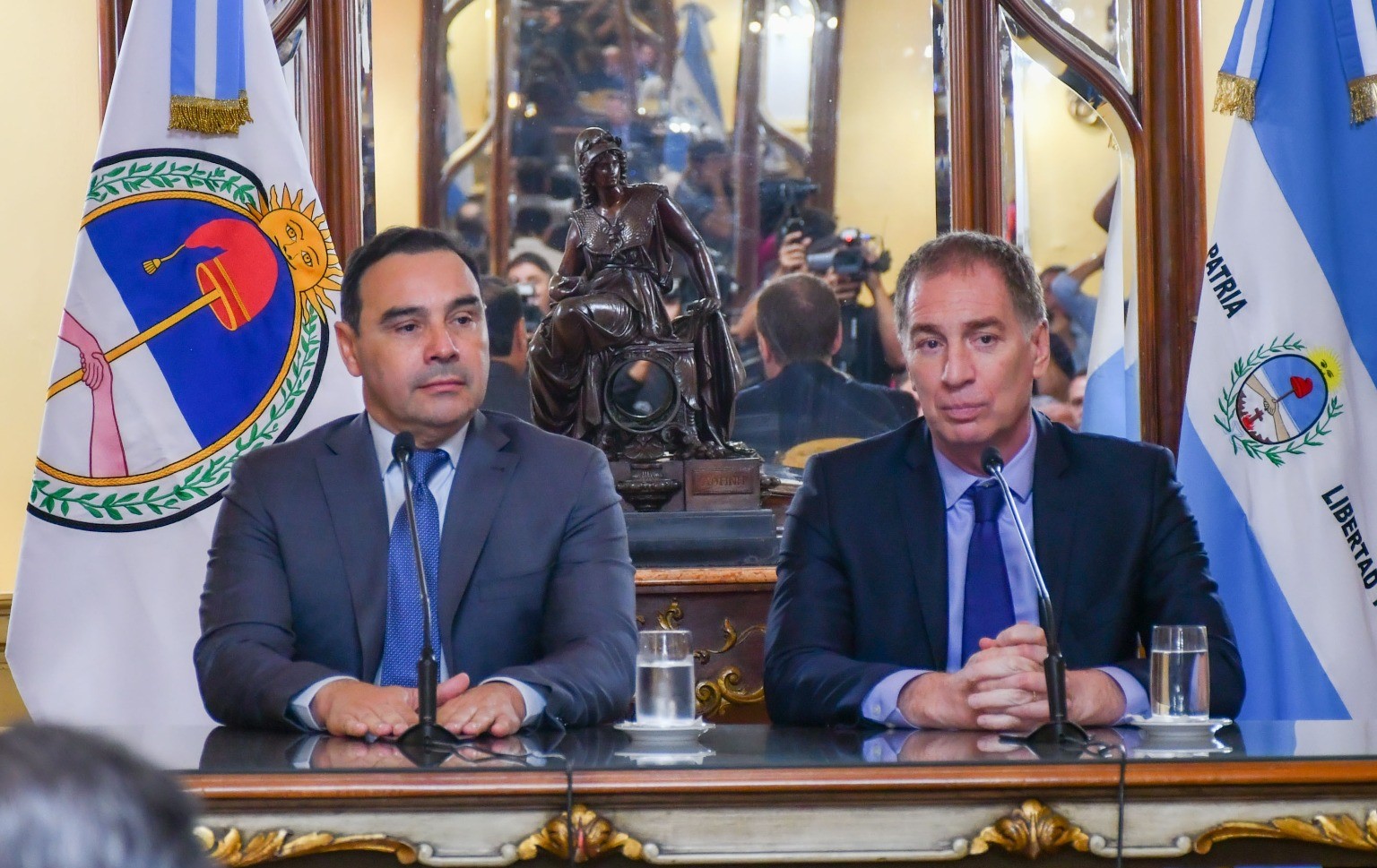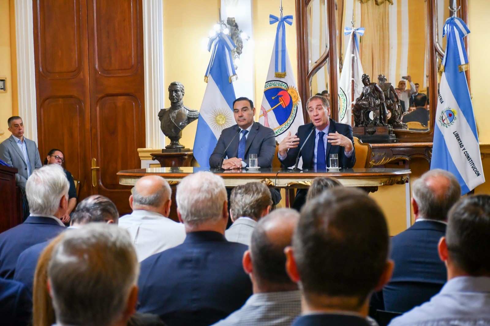 Tras el encuentro que se concretó un rato antes en el despacho del gobernador de Corrientes, Gustavo Valdés, él y el ministro del Interior, Diego Santilli, brindaron esta mañana una conferencia de prensa en el Salón Amarillo.