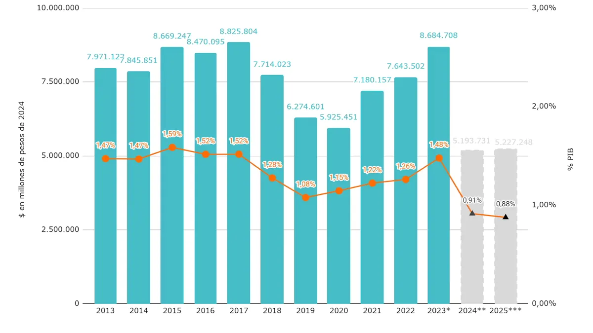 En términos del PBI, la inversión nacional en educación en 2025 será del 0,88% del PBI, por debajo de lo invertido en 2024 (0,91%) y 2023 (1,48%). En términos reales, el proyecto de presupuesto estipula que la inversión con fondos nacionales crecerá 0,65%; este año cayó 40,20% interanual. La educación superior recibirá el 66,5% del presupuesto de la Secretaría de Educación, seguido por el Plan Nacional por la Alfabetización que recibirá el 11,6%.