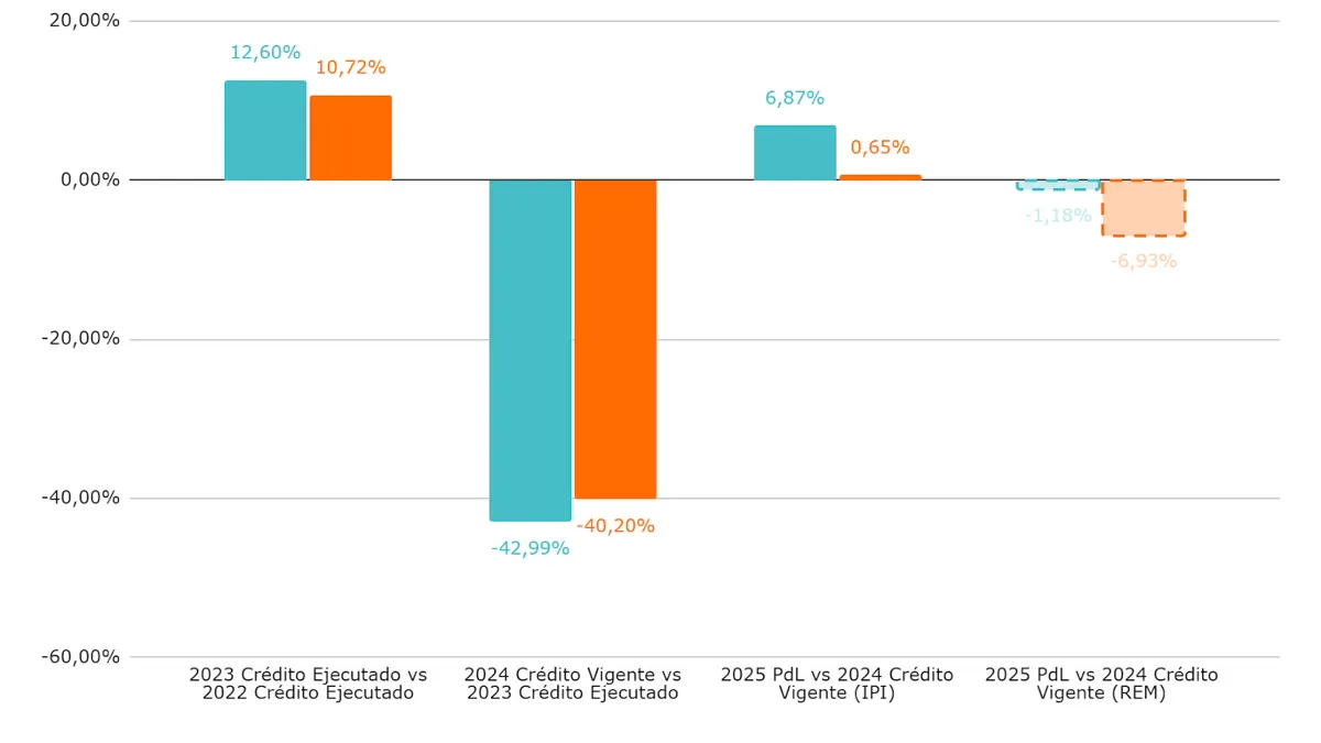 En el período 2023-2024 hubo una fuerte caída en términos reales, tanto en el gasto de la Secretaría de Educación (-42,99%) como en la función “Educación y Cultura” (-40,20%). Para 2025 se espera que el presupuesto de la Secretaría de Educación varíe un 6,87% respecto al cierre proyectado para 2024, mientras que para la función “Educación y Cultura” se espera una mejora del 0,65%, según la inflación considerada en el proyecto de ley. En cambio, si se considera la inflación del Relevamiento de Expectativas del Mercado (REM), en 2025 habrá una nueva caída de la inversión en términos reales, tanto de la Secretaría de Educación (-1,18%) como de la función “Educación y Cultura” (-6,93%).