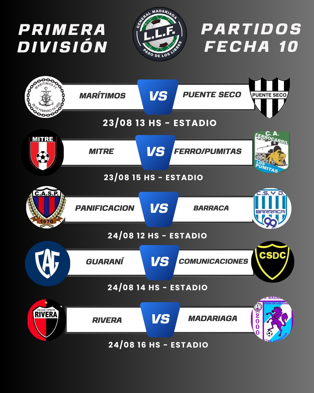 Organizado por la Liga Libreña de Fútbol (LLF) se disputará el fin de semana la décima fecha del Torneo de Primera División, con encuentros programados en el estadio “Agustín Faraldo” para el sábado 23 y domingo 24 de agosto.