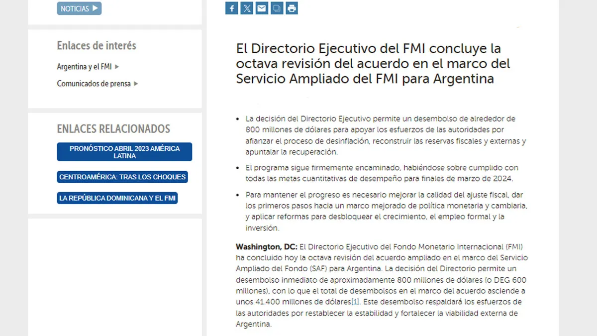 Esto permitirá, como se informó en su momento, la llegada de fondos frescos, unos US$800 millones. Aunque el Presidente y el equipo económico aspiran a que el FMI realice un nuevo acuerdo que represente más fondos para la Argentina, que no solo se usen para pagar la deuda con ese organismo sino que permitan avanzar en las reformas que reclama.