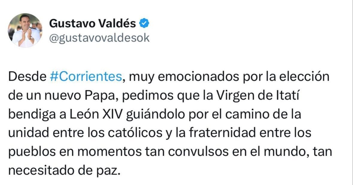 Se dio a conocer hoy que el norteamericano Robert Francis Prevost, que se llama León XIV, fue elegido como el nuevo Papa de la Iglesia Católica, y por ello, el gobernador de Corrientes, Gustavo Valdés, envió su mensaje dirigido al Pontífice, a través de sus cuentas en redes sociales.