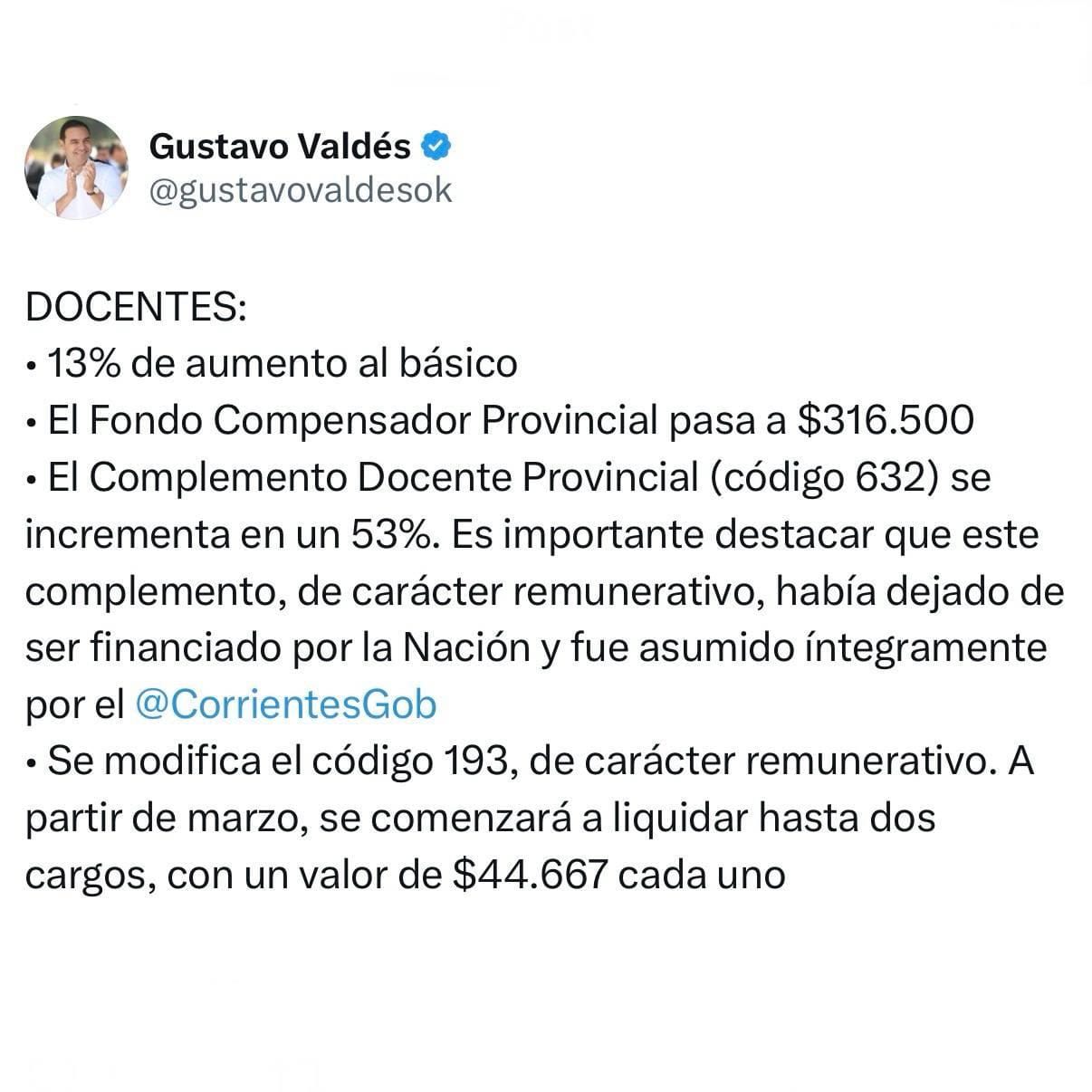 - El Complemento Docente Provincial (código 632) se incrementa en un 53%. Es importante destacar que este complemento, de carácter remunerativo, había dejado de ser financiado por la Nación y fue asumido íntegramente por el @CorrientesGob.