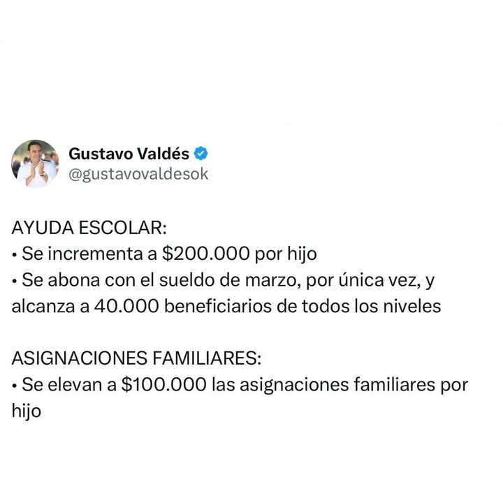 Las mejoras, realizadas por instrucción del gobernador Gustavo Valdés, con diseño del Ministerio de Hacienda y Finanzas, consisten en incrementos superiores al 13%; elevó a $200.000 la ayuda escolar y a $100.000 las asignaciones familiares, entre otros beneficios.