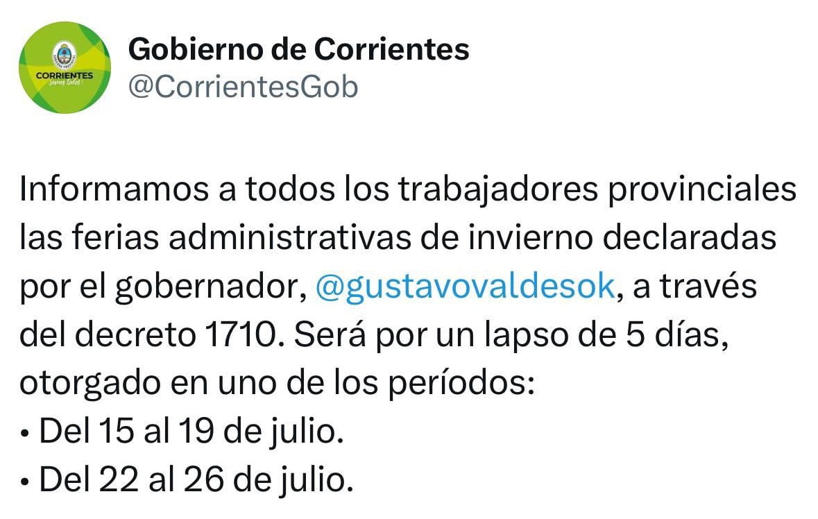El anuncio, fue comunicado en la red social X del Gobierno de Corrientes y el mismo, dice lo siguiente: “Informamos a todos los trabajadores provinciales, las ferias administrativas de invierno declaradas por el gobernador. Gustavo Valdés, a través del decreto 1710. Será por un lapso de 5 días, otorgado en uno de los períodos: del 15 al 19 de julio y del 22 al 26 de julio”.