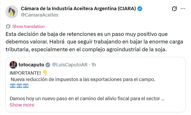 “Esta decisión de baja de retenciones es un paso muy positivo que debemos valorar. Habrá que seguir trabajando en bajar la enorme carga tributaria, especialmente en el complejo agroindustrial de la soja”, señaló CIARA en su cuenta de X, al replicar la medida anunciada por el ministro de Economía, Luis Caputo, que alcanza a la soja, el trigo, la cebada, el maíz, el sorgo, el girasol, entre otros productos.