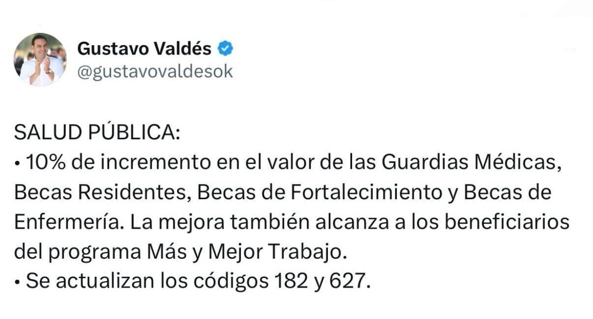 En Salud Pública, para las Guardias Médicas, el aumento es del 10%, mismo incremento para los Residentes (Provinciales y Nacionales), Becas de Fortalecimiento y Becas de Enfermería. Esta mejora alcanza a los beneficiarios del programa Más y Mejor Trabajo.