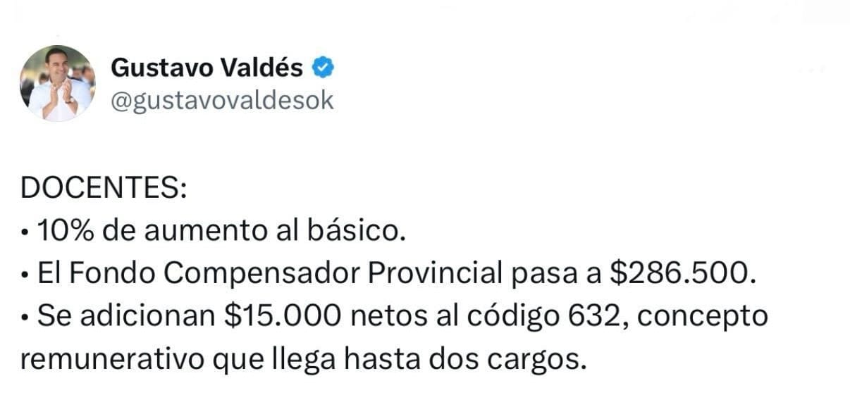 En el sector Docente, el aumento al básico es de un 10%. También, el Fondo compensador provincial docente se incrementa en $35.000, pasando a la suma de $286.500, hasta septiembre fue de $251.500.