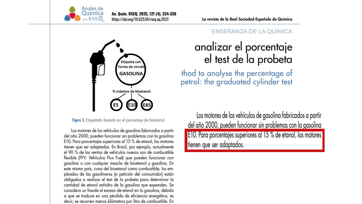 Por ejemplo, un trabajo de la Revista de la Sociedad Española de Química especifica claramente el límite máximo de bioetanol tolerable por los motores. Es del 15% . “Para porcentajes superiores al 15% de etanol, los motores tienen que se adaptados.
