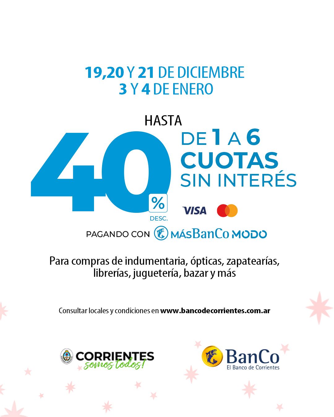 Pagando con MODO habrá hasta un 40% de descuento en diferentes comercios”, especificaron, en tanto los locales y condiciones de compra se pueden conocer de manera detallada en el sitio www.bancodecorrientes.com.ar