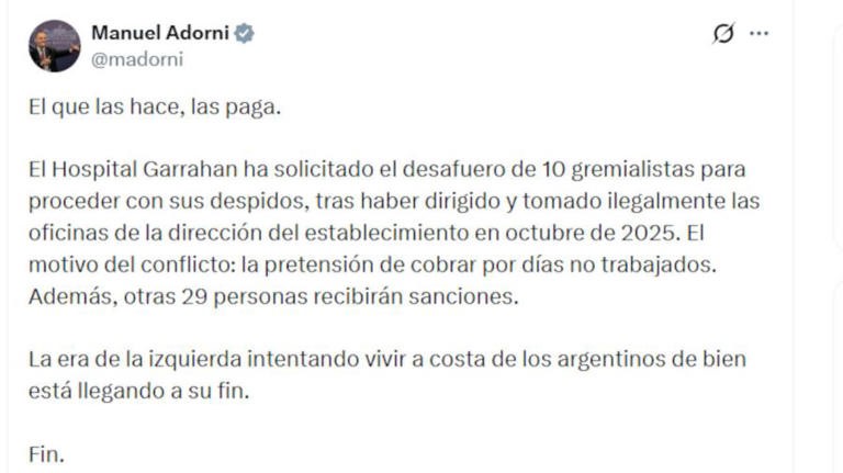 A través de su cuenta oficial en la red social X, Adorni sostuvo que “el que las hace, las paga” y confirmó que el Hospital Garrahan había solicitado el desafuero de diez gremialistas para avanzar con sus despidos, a quienes acusó de haber dirigido una “toma ilegal” de las oficinas de la dirección. En el mismo mensaje, Adorni atribuyó el origen del conflicto a un reclamo por el pago de días no trabajados, informó que otras 29 personas recibirán sanciones y encuadró la medida en una ofensiva más amplia contra lo que definió como “la izquierda intentando vivir a costa de los argentinos de bien”.