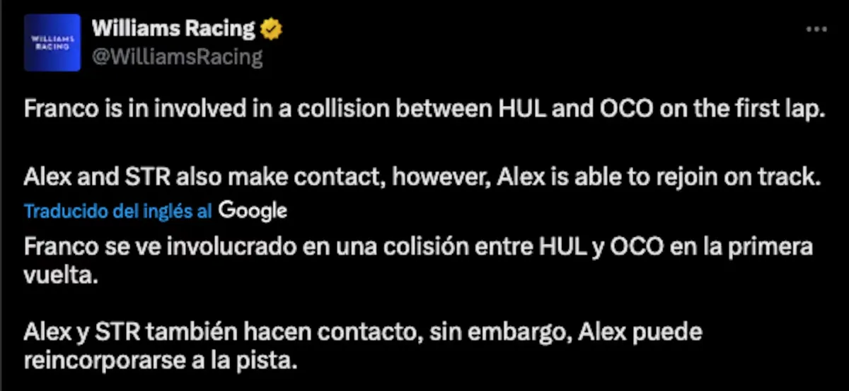 La escudería Williams se refirió a esta situación y aclaró: “Franco se vio involucrado en una colisión entre HUL y OCO en la primera vuelta. Alex y Stroll también hacen contacto, sin embargo, Alex puede reincorporarse a la pista”.