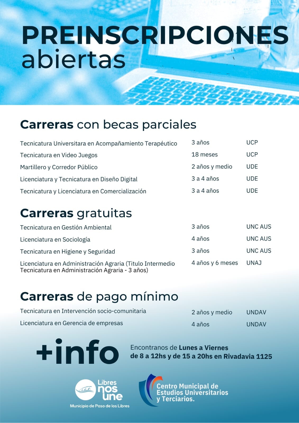 Desde la Municipalidad de Paso de los Libres se anunció la apertura de las preinscripciones a diversas carreras técnicas y universitarias a través del Centro Municipal de Estudios Universitarios y Terciarios.
