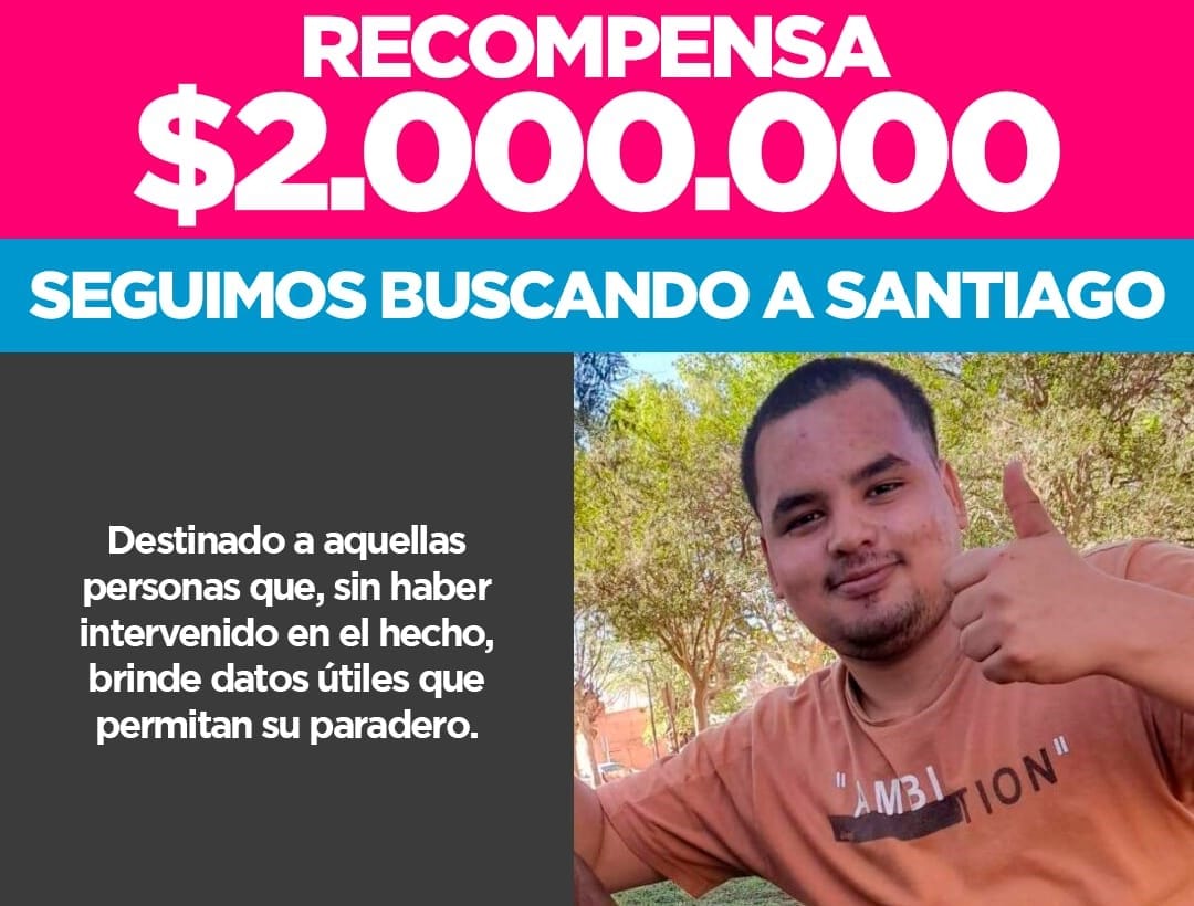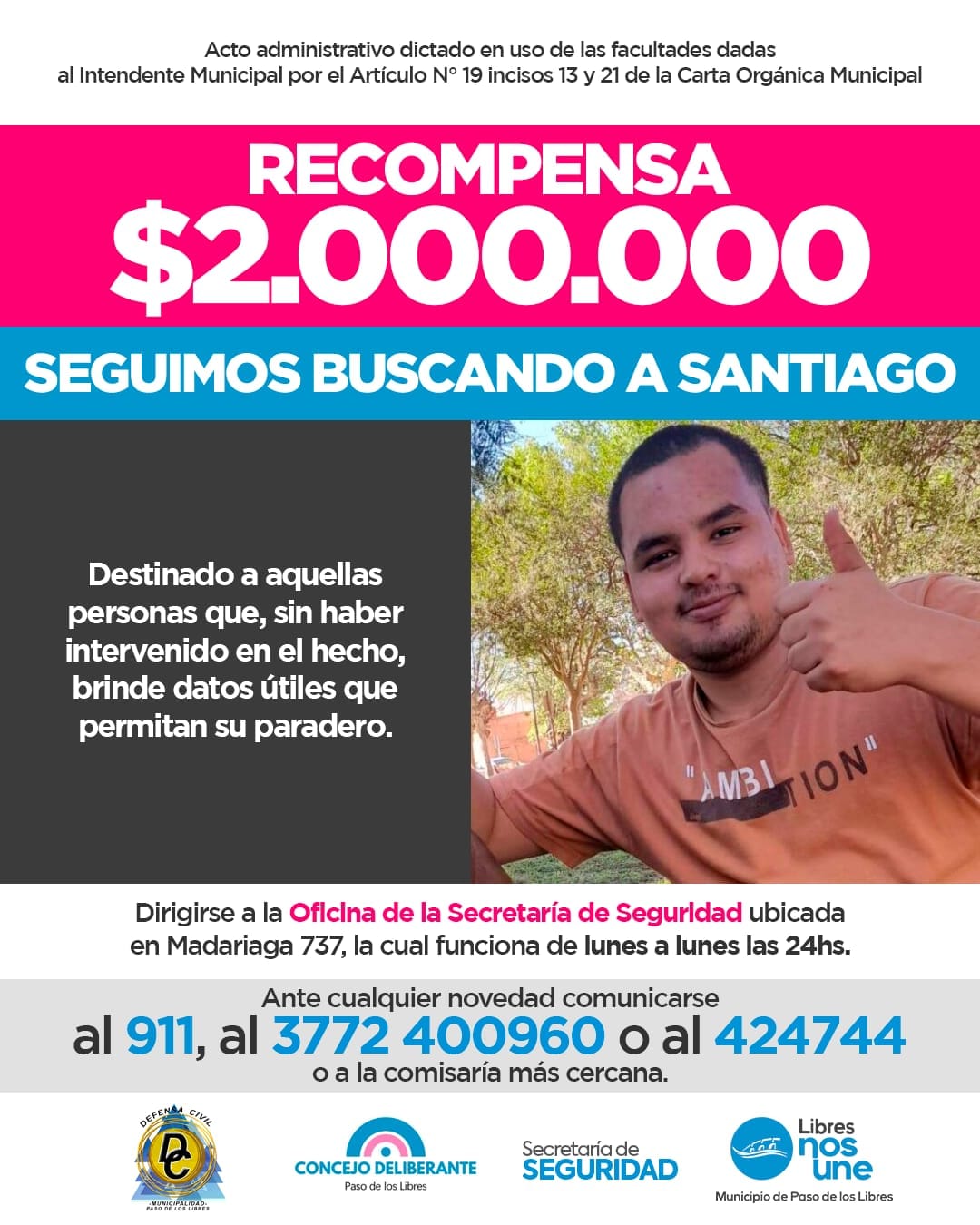 Ante la necesidad de estimular el aporte de información sobre el posible paradero de Santiago, el Municipio y el Concejo Deliberante se dispuso ahora una recompensa de $2.000.000 para quienes aporten datos certeros que ayuden a ubicarlo.