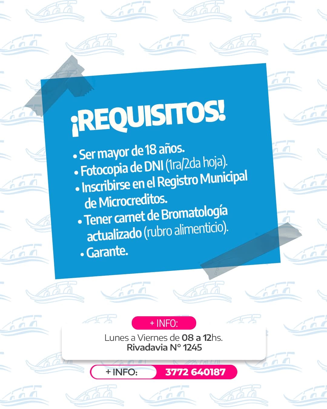 Quienes deseen acceder al programa deben cumplir con los siguientes requisitos: Ser mayores de 18 años, presentar fotocopia del DNI (primera y segunda hoja), inscribirse en el Registro Municipal de Microcréditos, contar con carné de Bromatología actualizado (en caso de pertenecer al rubro alimenticio) y presentar un garante.