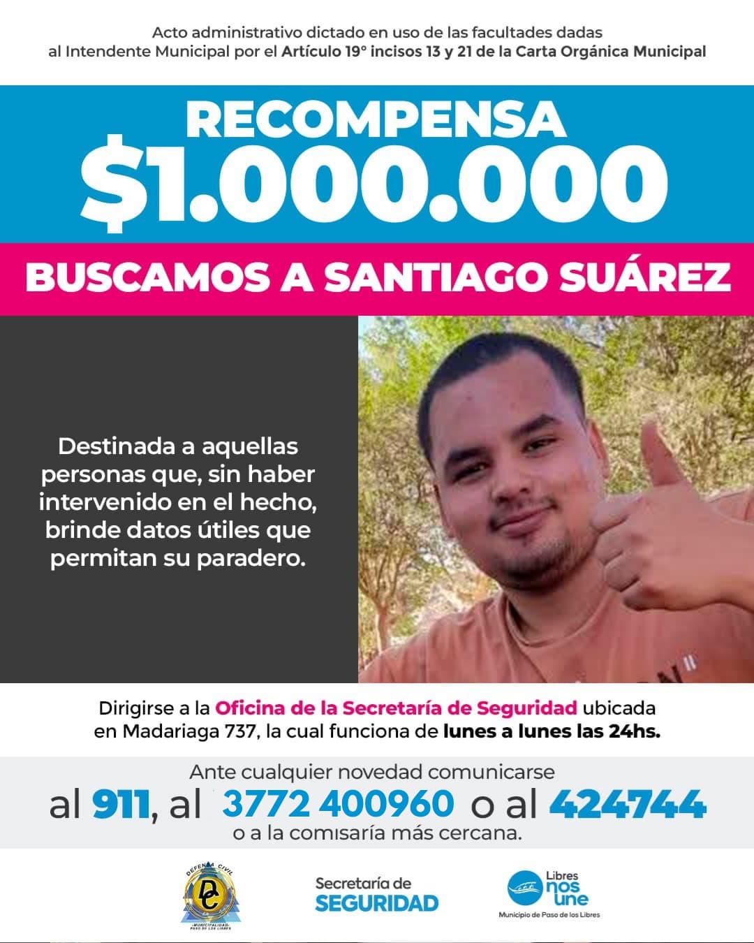 El intendente municipal de Paso de los Libres, Martín Ascúa, rubricó la Resolución N°085, mediante la cual se establece una recompensa de un millón de pesos para aquellas personas que aporten información veraz sobre el paradero de Diego Santiago Suárez, joven de 21 años desaparecido desde el 15 de febrero de 2025.