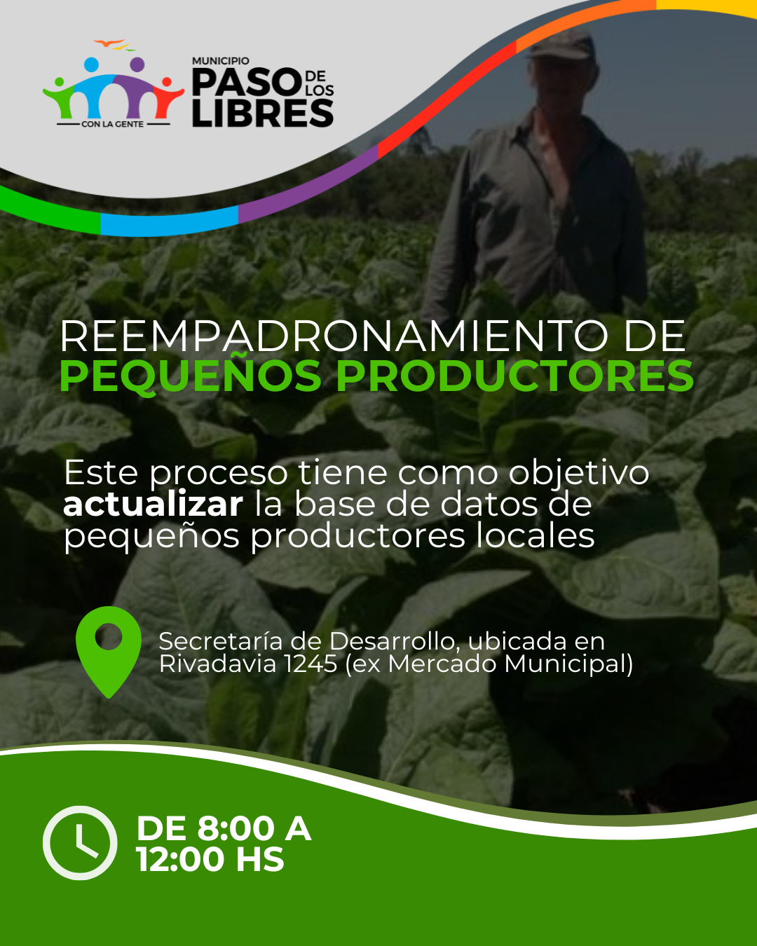 El reempadronamiento está destinado exclusivamente a pequeños productores, incluyendo productores agrícolas, hortícolas, emprendedores rurales y demás actores del sector productivo local que desarrollen actividades a pequeña escala. Los interesados deberán presentarse para la actualización de sus datos.