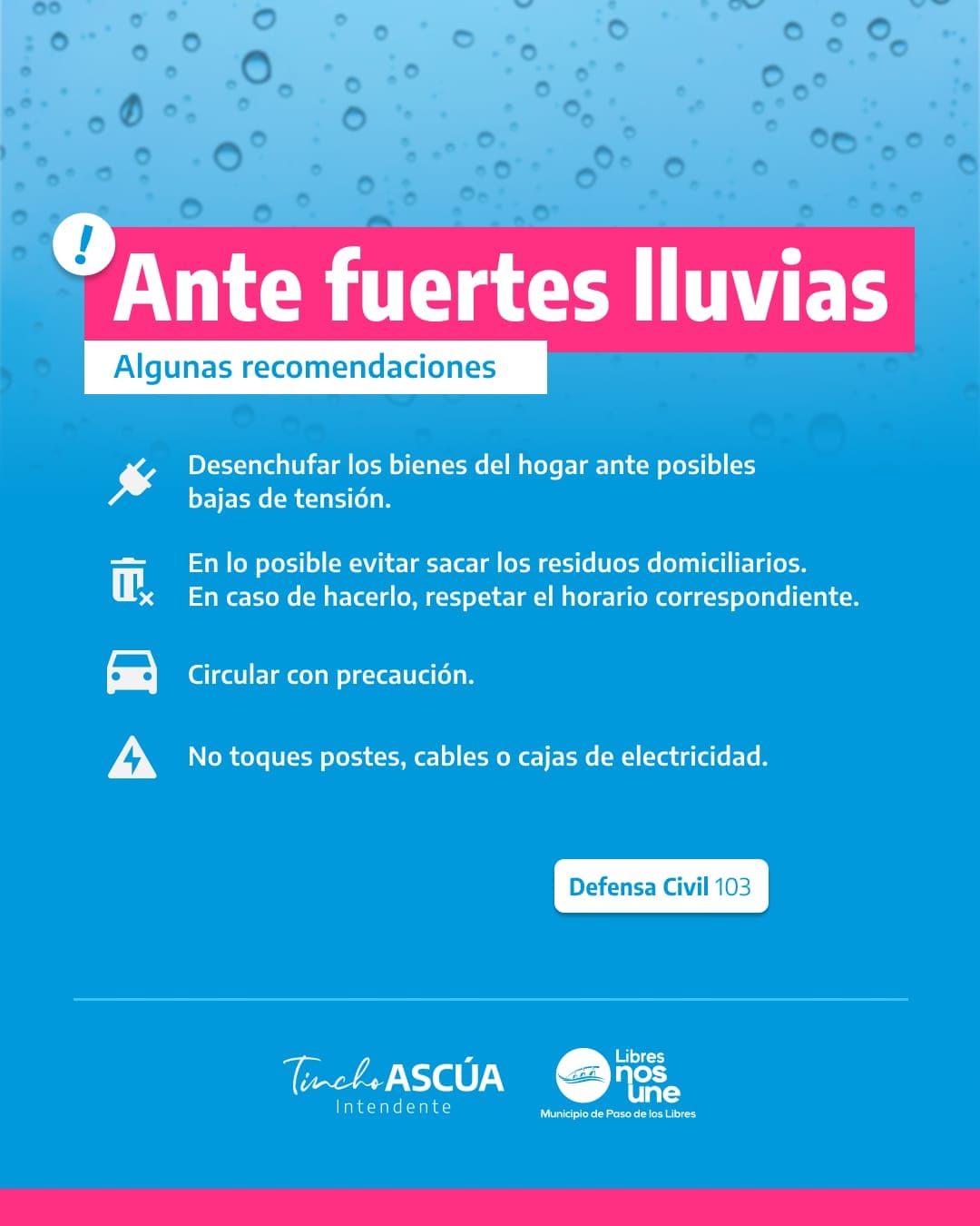 El Municipio de Paso de los Libres, a través de sus áreas operativas, recuerda a la comunidad una serie de medidas preventivas ante posibles lluvias intensas que puedan registrarse en la ciudad en las próximas horas.