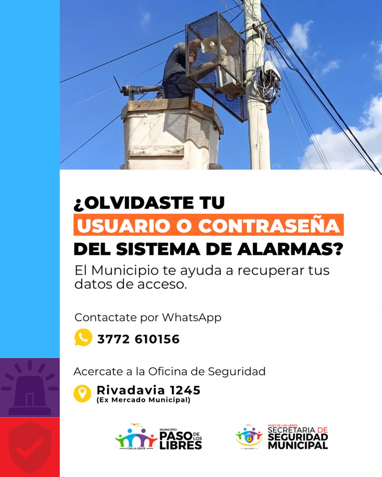 Quienes utilizan el sistema de alarmas vecinales y que hayan extraviado o no recuerdan su usuario y contraseña, deberán comunicarse con la Secretaría de Seguridad de la Municipalidad de Paso de los Libres para realizar la recuperación o asignación de nuevos datos de acceso.