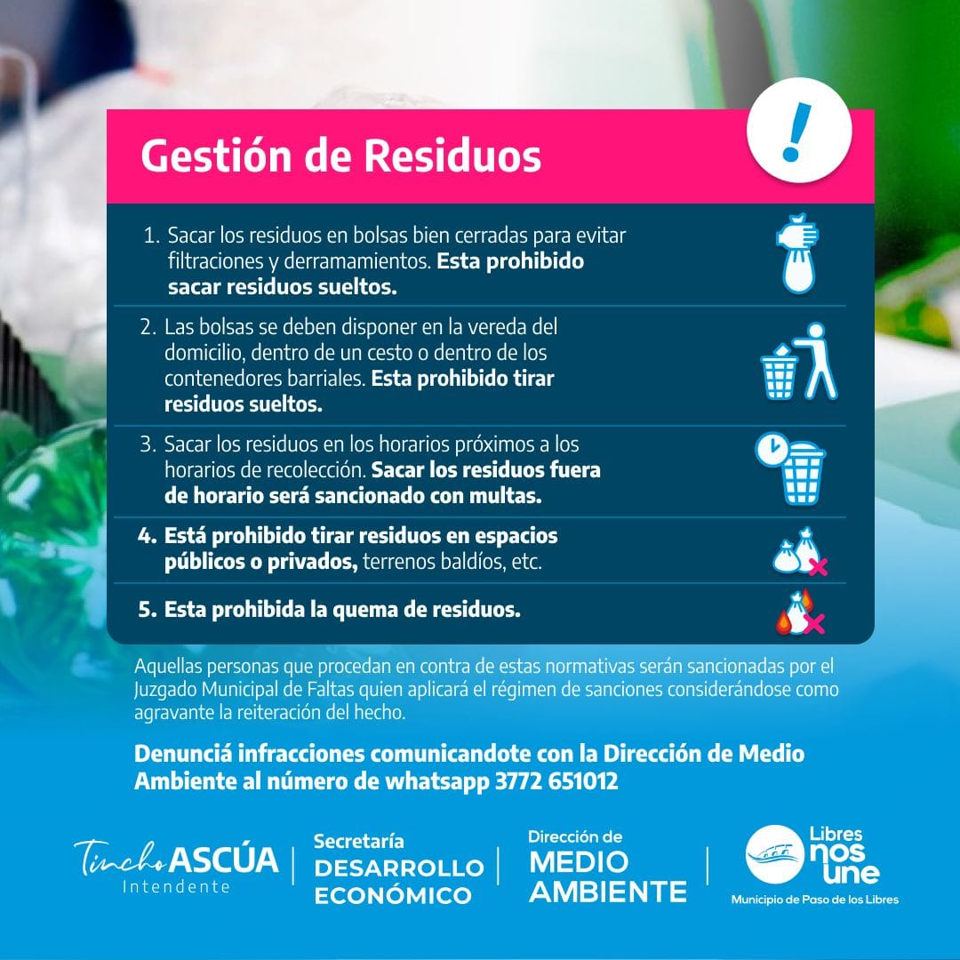 El Municipio de Paso de los Libres, a través de la Dirección de Medio Ambiente, recuerda a los vecinos que está en vigencia la Ordenanza Municipal N°977/12, la cual regula la correcta disposición de los residuos domiciliarios en la vía pública.