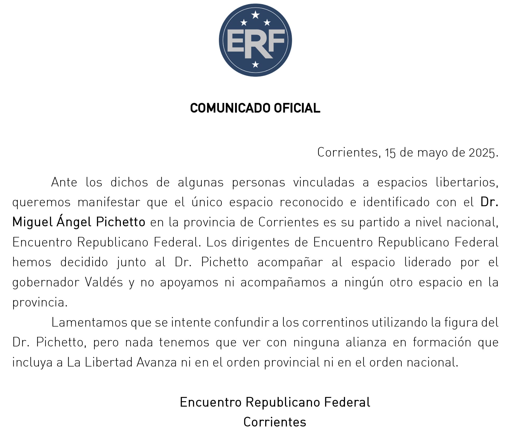En el texto, con fecha 15 de mayo en la ciudad de Corrientes, remarcan que “el único espacio reconocido e identificado con el Dr. Miguel Ángel Pichetto en la provincia de Corrientes es su partido a nivel nacional, Encuentro Republicano Federal”.