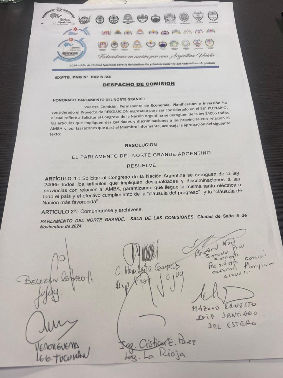 Coordinando la Presidencia de Economía, Planificación e inversión, se aprobó el dictamen para tratar hoy, en el Plenario de las 10 provincias del Parlamento del Norte Grande, el proyecto presentado por los correntinos sobre modificación en el Congreso de la Nación de la Ley N°24.065 (Ley CAMMESA).