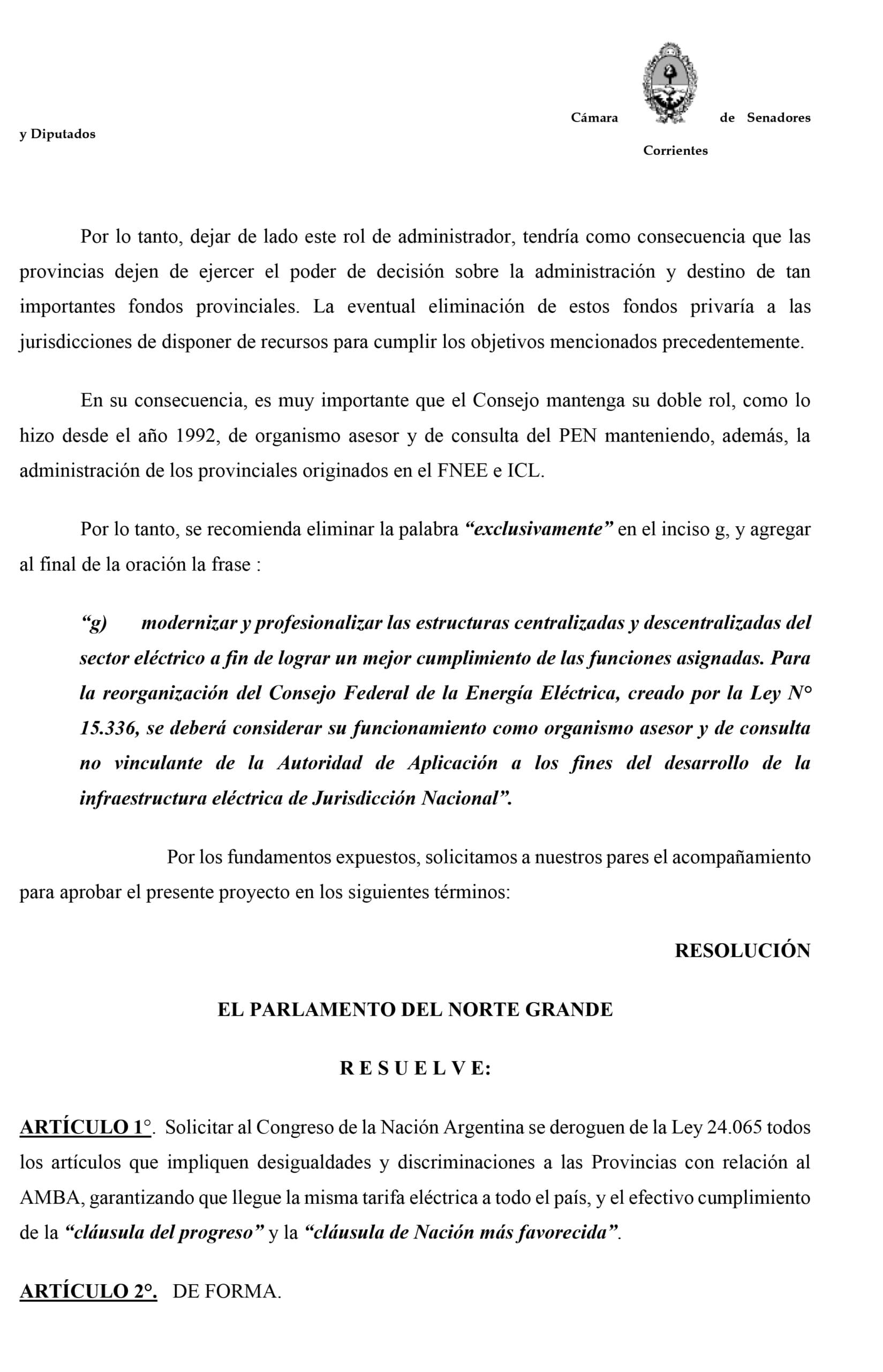 Coordinando la Presidencia de Economía, Planificación e inversión, se aprobó el dictamen para tratar hoy, en el Plenario de las 10 provincias del Parlamento del Norte Grande, el proyecto presentado por los correntinos sobre modificación en el Congreso de la Nación de la Ley N°24.065 (Ley CAMMESA).