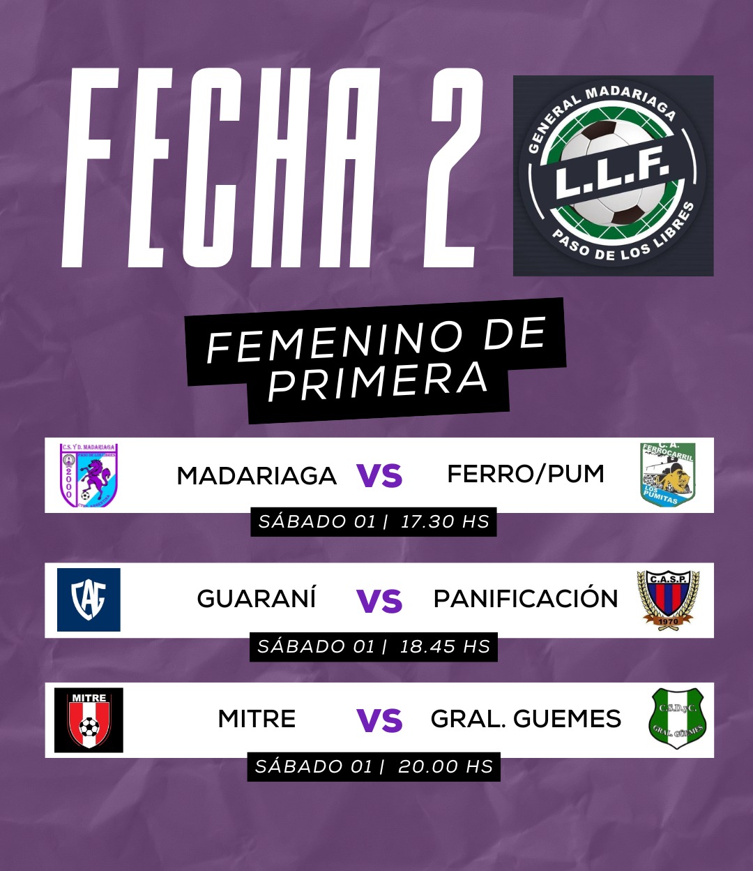 La Liga Libreña de Fútbol (LLF) reprogramó la segunda fecha del Torneo de Primera División Femenino y este sábado 1 de noviembre se jugará la segunda fecha en el estadio “Agustín Faraldo”, con tres encuentros.