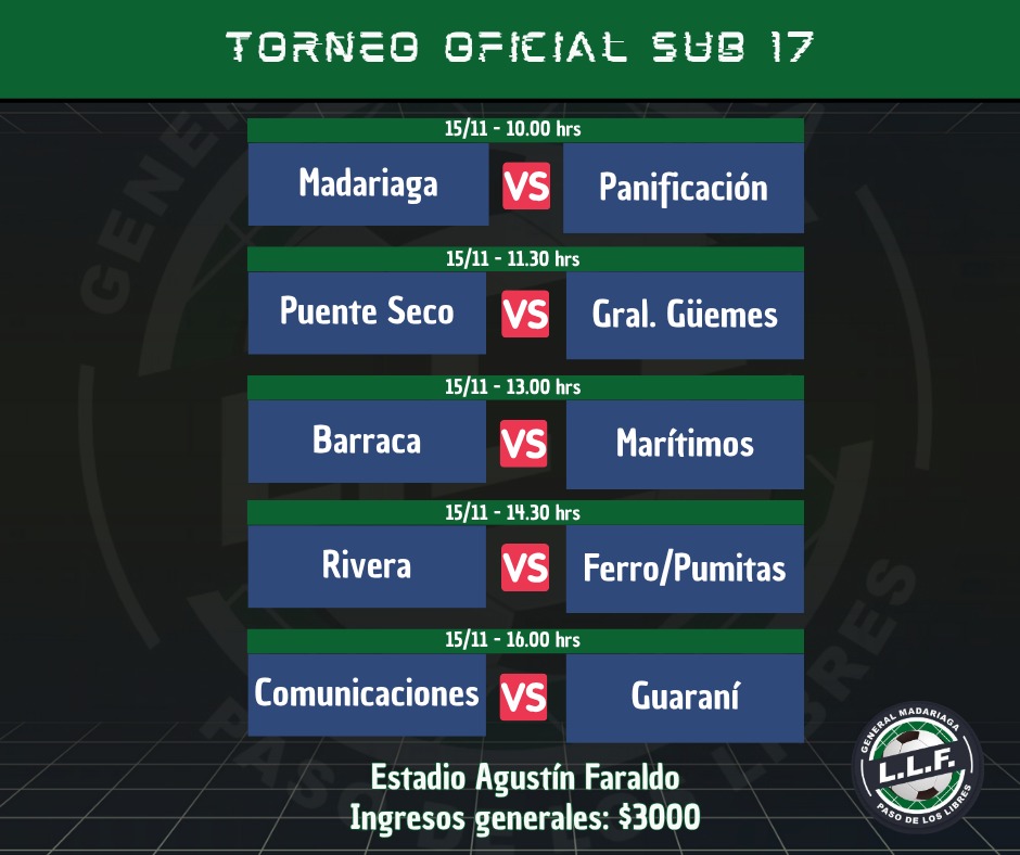 En el marco del Torneo Oficial Sub17 de la Liga Libreña de Fútbol (LLF), el sábado 15 de noviembre se desarrollará la quinta fecha, con partidos que comenzarán a las 10 horas y se disputarán en su totalidad en el estadio “Agustín Faraldo”.