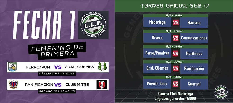 La Liga Libreña de Fútbol propone el Torneo Femenino de Primera División, que se jugará de tarde en el estadio “Agustín Faraldo”. Y la tercera fecha del del Torneo Oficial Sub17, que será de mañana y tendrá como escenario la cancha de Madariaga.