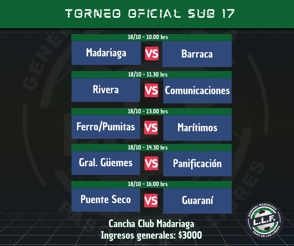 Asimismo, en la mañana sabatina continuará la disputa del Torneo Oficial Sub17 “General Madariaga”, en cuyo marco se disputará la tercera fecha con atractivos encuentros que se desarrollarán en la cancha del Club Madariaga.