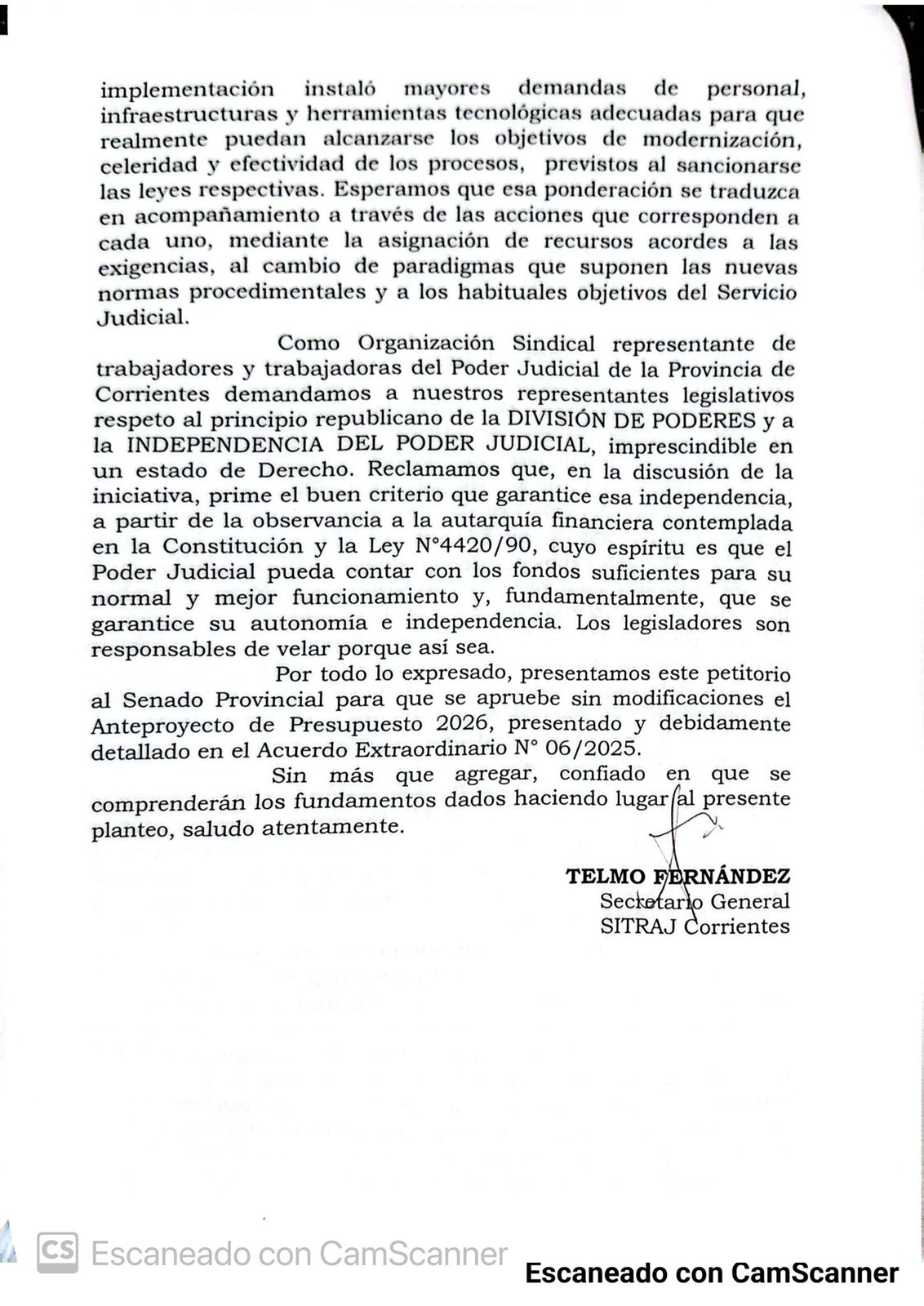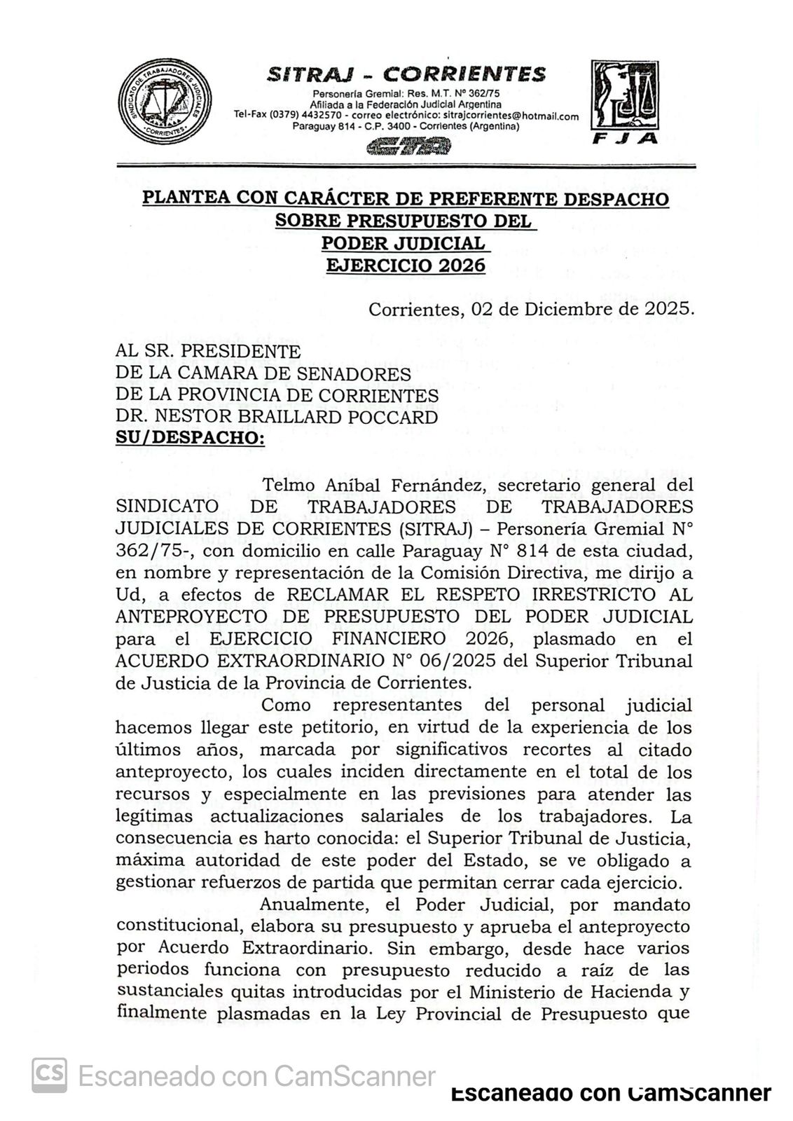 Acompañados por un grupo de trabajadores, miembros de Comisión Directiva del Sindicato de Trabajadores Judiciales de Corrientes (SITRAJ) llegaron a la Legislatura y presentaron el petitorio a la Cámara Alta, donde ingresó el proyecto de Presupuesto General de la Provincia para el año venidero, con un drástico recorte (de casi 36%) a las previsiones del Poder Judicial.
