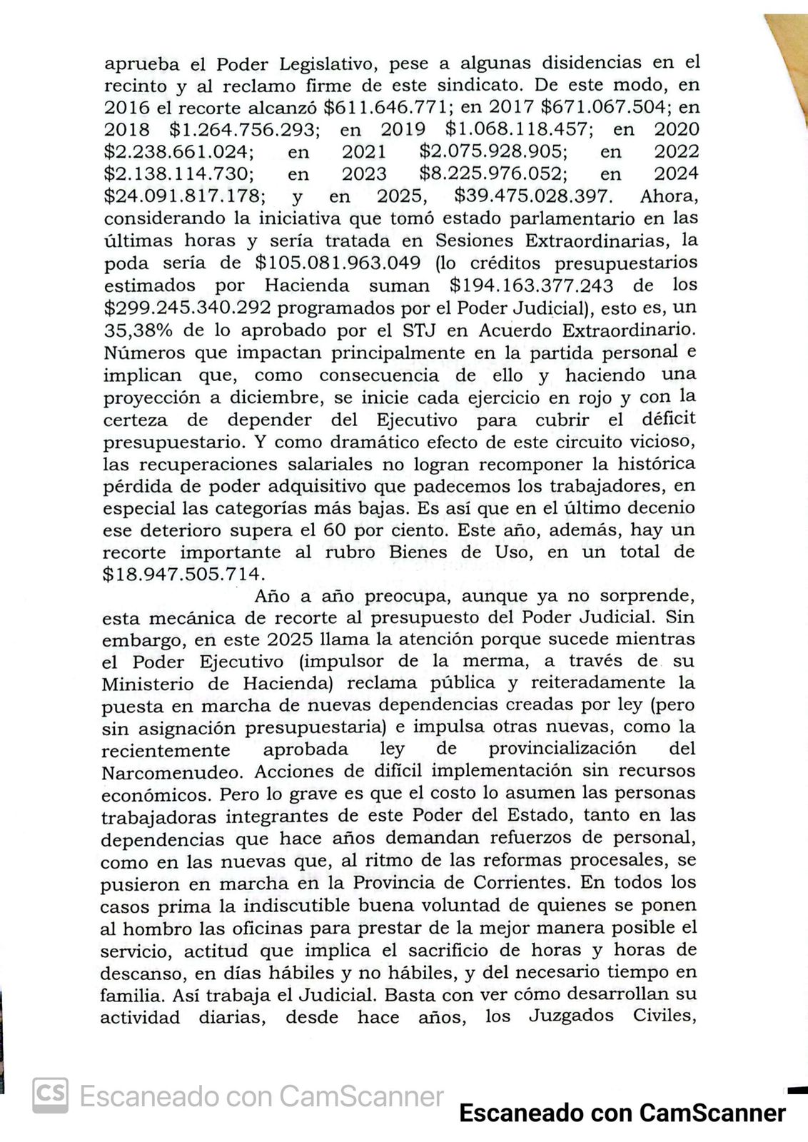 Además, puntualizaron que el sindicato lleva varios años encarando esta gestión cada vez que el Ejecutivo eleva el proyecto de Presupuesto “siempre con recortes, cuyos efectos pagamos los trabajadores y las trabajadoras judiciales con menos salario, menos compañeros/as en las oficinas y menos inversiones en recursos indispensables para el servicio”.