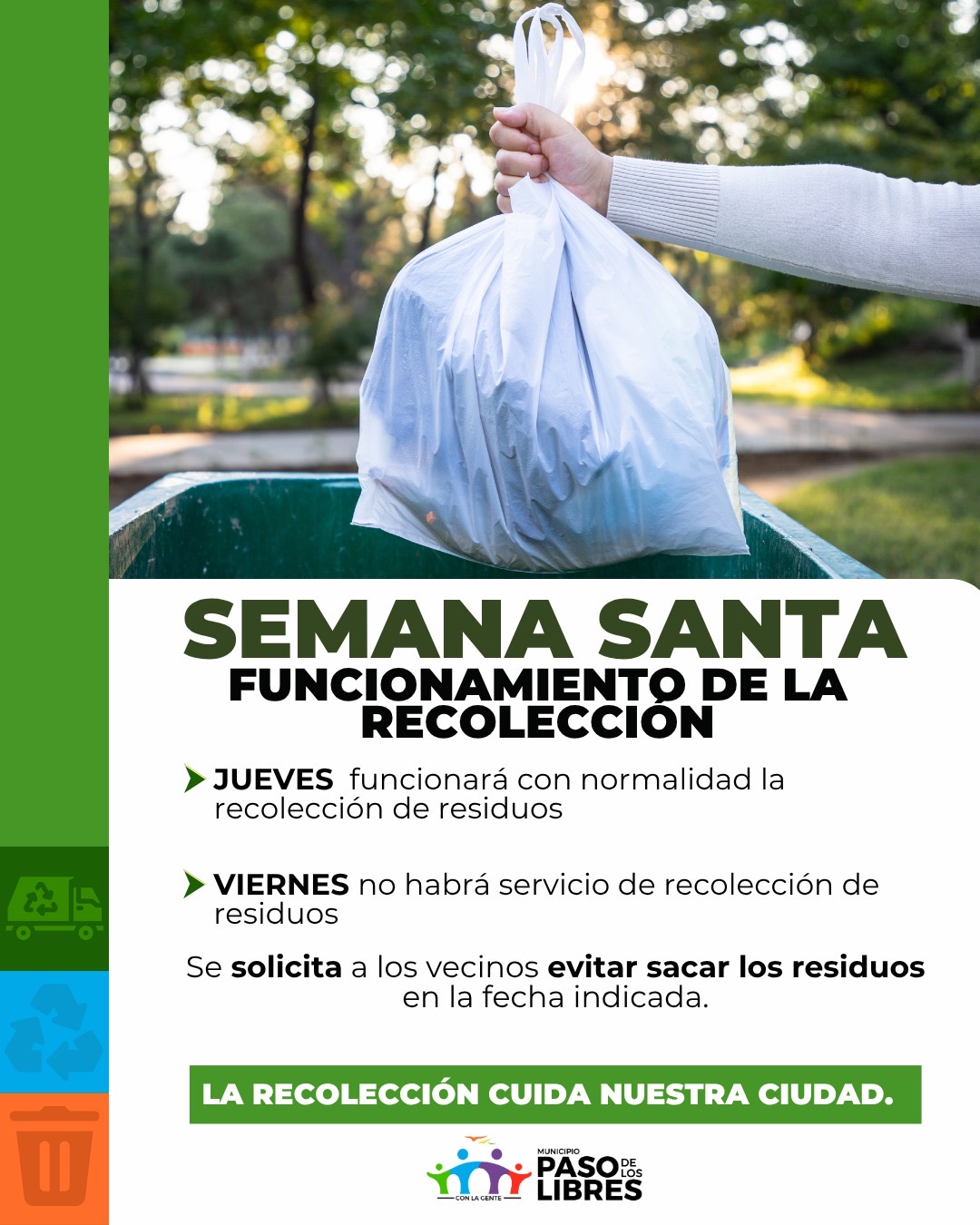 La Municipalidad de Paso de los Libres dio a conocer el cronograma establecido para la prestación del servicio de recolección de residuos durante Semana Santa.