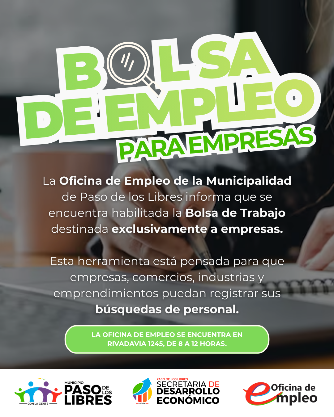 Se encuentra habilitada la Bolsa de Trabajo de la Oficina de Empleo de la Municipalidad de Paso de los Libres, la cual está destinada exclusivamente a empresas con el objetivo de fortalecer el vínculo entre el sector productivo local y quienes buscan insertarse en el mercado laboral.