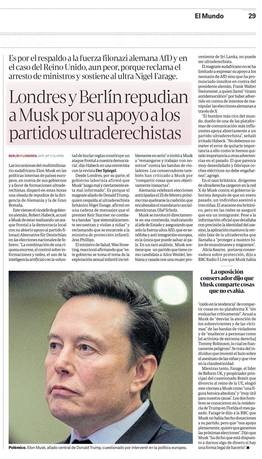 Pero la alarma roja suena cuando Musk apoya en Alemania al partido AFD, filo nazi, en las elecciones de febrero, poniendo su tecnología al servicio de la extrema derecha xenófoba, antisemita.