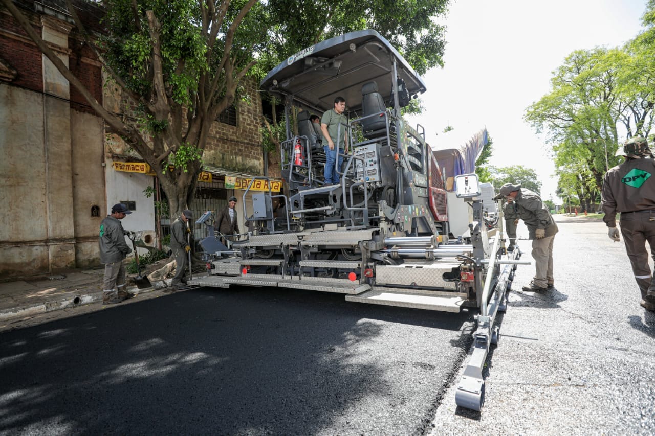 La importante maquinaria está compuesta por una terminadora de asfalto sobre orugas, un compactador neumático y un compactador combinado.
