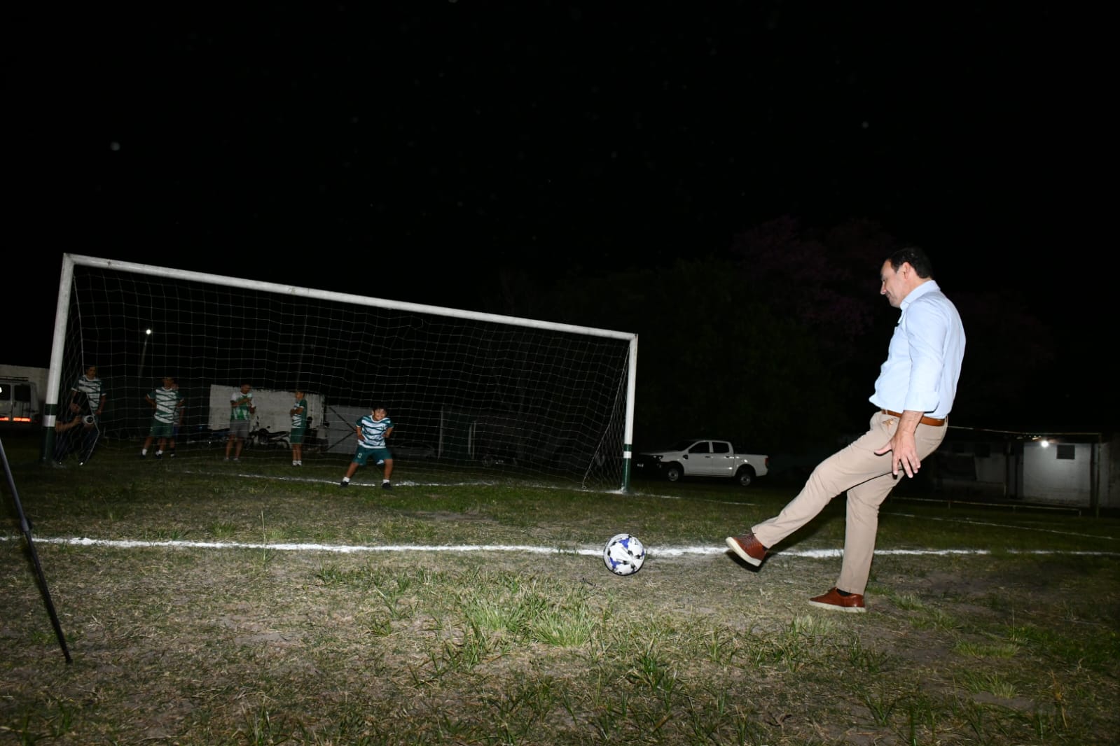 Informó que “llevamos concretados dichos trabajos en 20 canchas como ésta”. Y detalló así que “cuando uno se pone a pensar en números, son cerca de 1.600 millones de pesos, solamente en iluminación”.