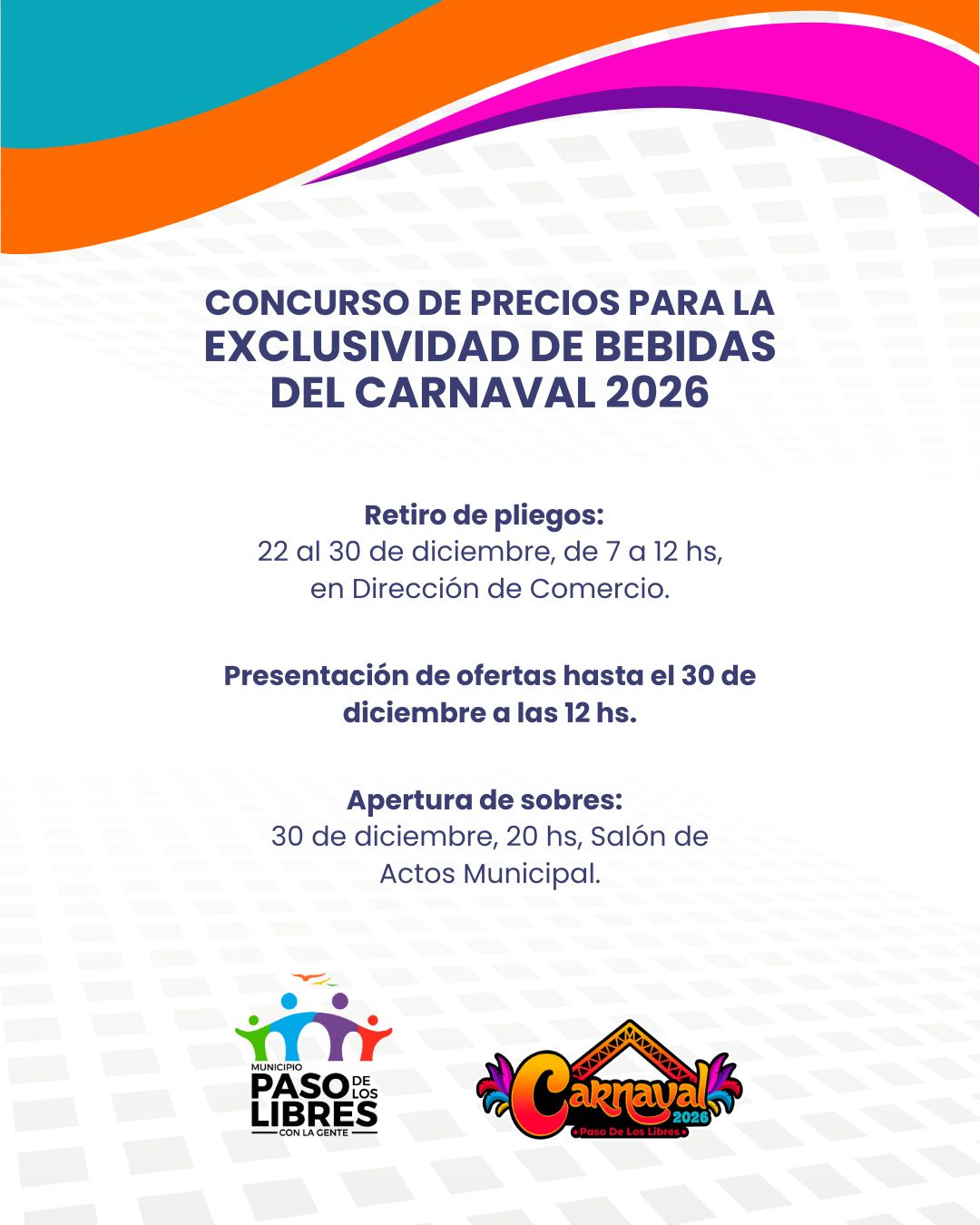 La Comisión Organizadora del Carnaval 2026 convoca a los interesados en participar del Concurso de Precios para la Exclusividad de Bebidas (alcohólicas y analcohólicas) para proveer a los bares del sambódromo durante las 4 noches del evento.