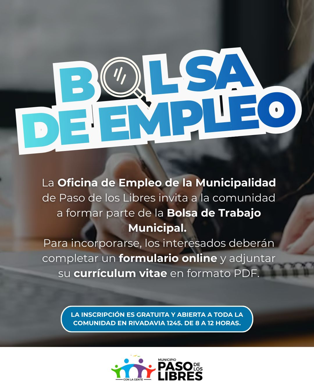 La Oficina de Empleo de la Municipalidad de Paso de los Libres invita a la comunidad a formar parte de la Bolsa de Trabajo Municipal, una herramienta destinada a organizar y centralizar los perfiles laborales de habitantes de la ciudad, con el objetivo de facilitar el acceso a futuras oportunidades de empleo.