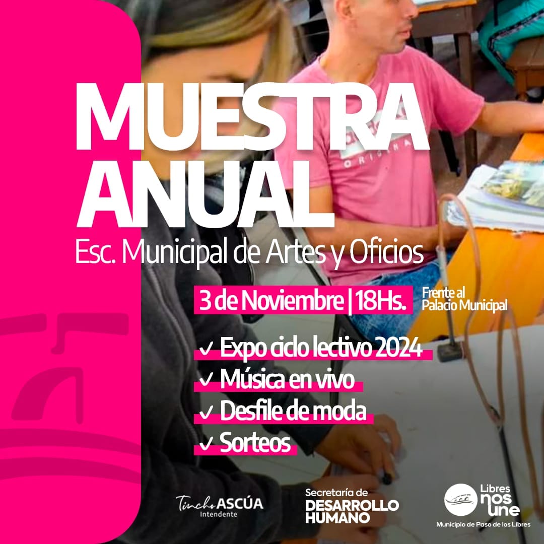 La Escuela Municipal de Artes y Oficios de Paso de los Libres llevará a cabo su Muestra Anual el próximo 3 de noviembre, a las 18 horas, frente al Palacio Municipal. Un evento que contará con una variada agenda que incluye la exposición de trabajos realizados durante el ciclo lectivo 2024, música en vivo, un desfile de moda y múltiples sorteos.