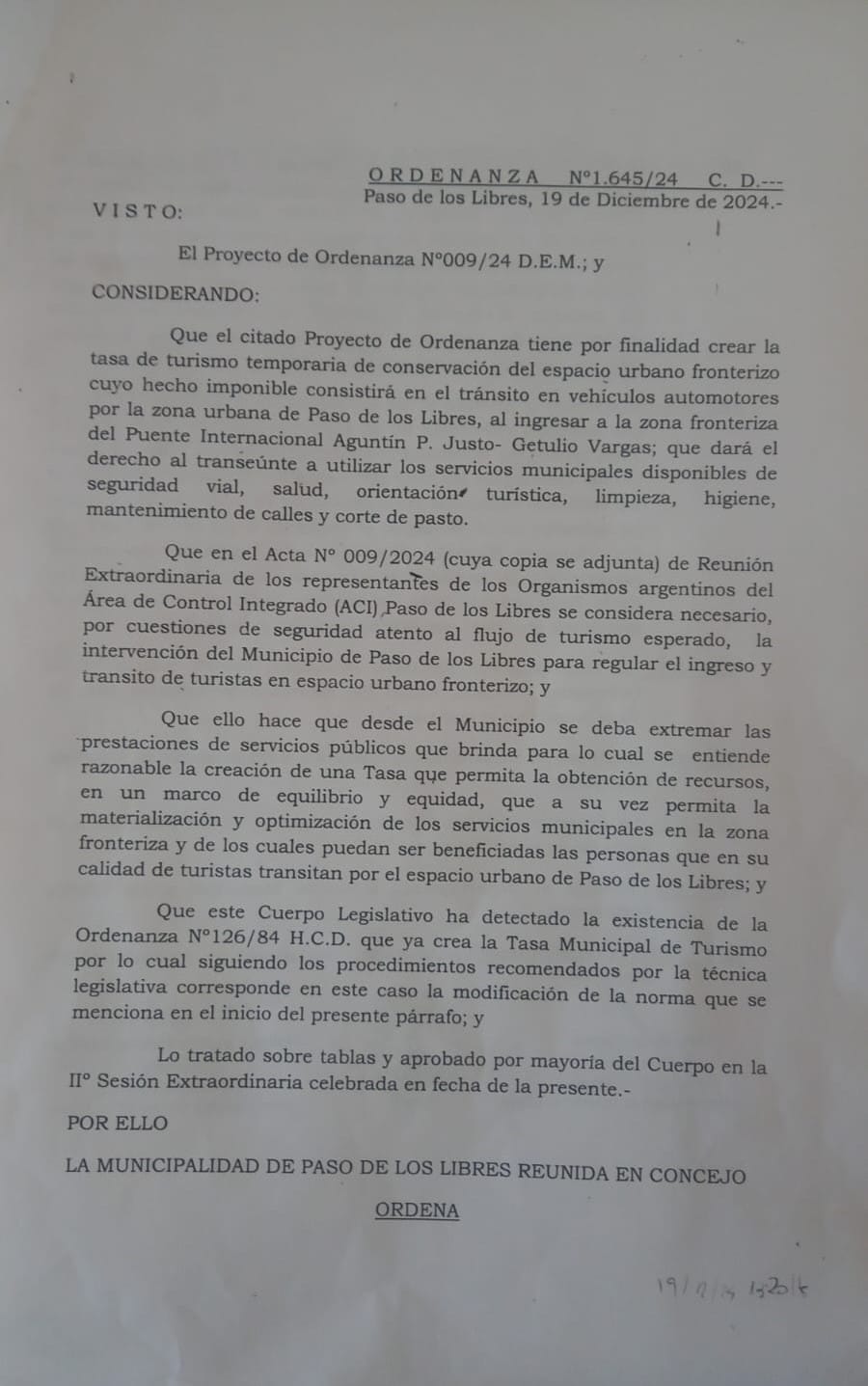 Una enorme repercusión en medios locales y en redes sociales tuvo la implementación de la Tasa de Turismo Temporaria de Conservación del Espacio Urbano Fronterizo; implementada por la Municipalidad de Paso de los Libres y que deben pagar los turistas o quienes ingresen a la ciudad y no tengan domicilio en ella.