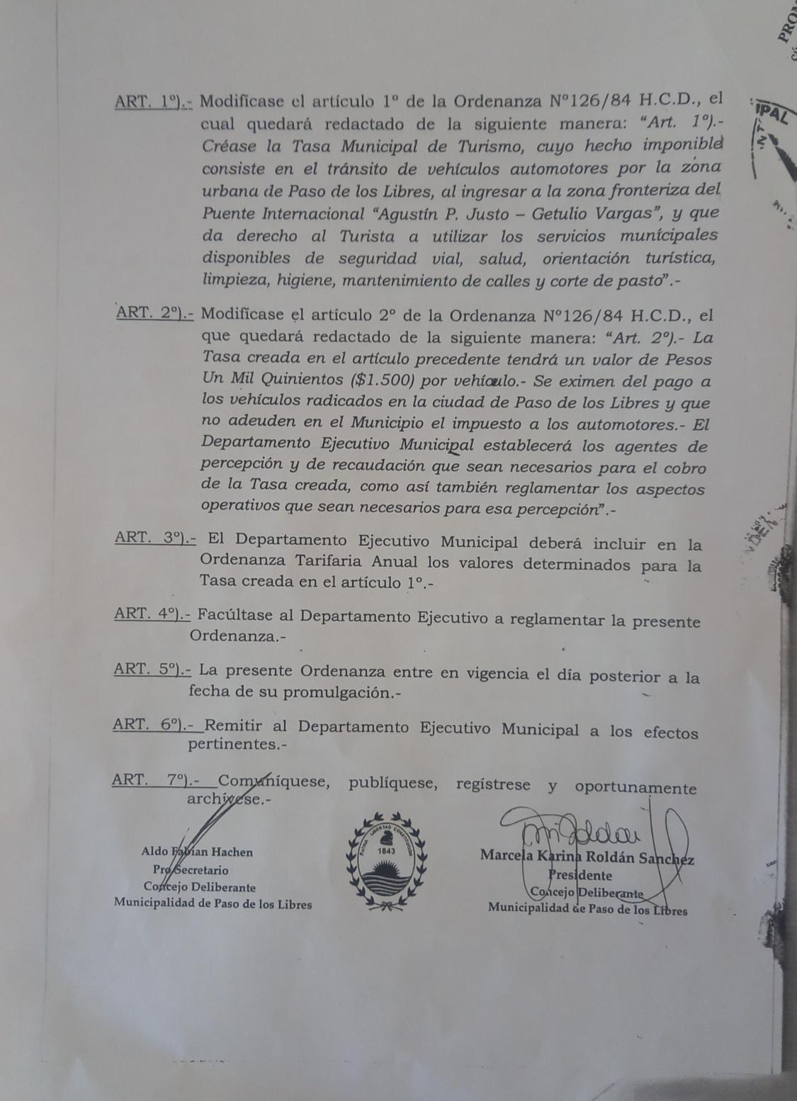 El tributo no es nuevo, pues fue establecido en 1984 mediante la Ordenanza N°126, la cual fue modificada y actualizada a través de la Ordenanza N°1.645, sancionada en la segunda sesión extraordinaria del Concejo Deliberante libreño celebrada el 19 de diciembre pasado.