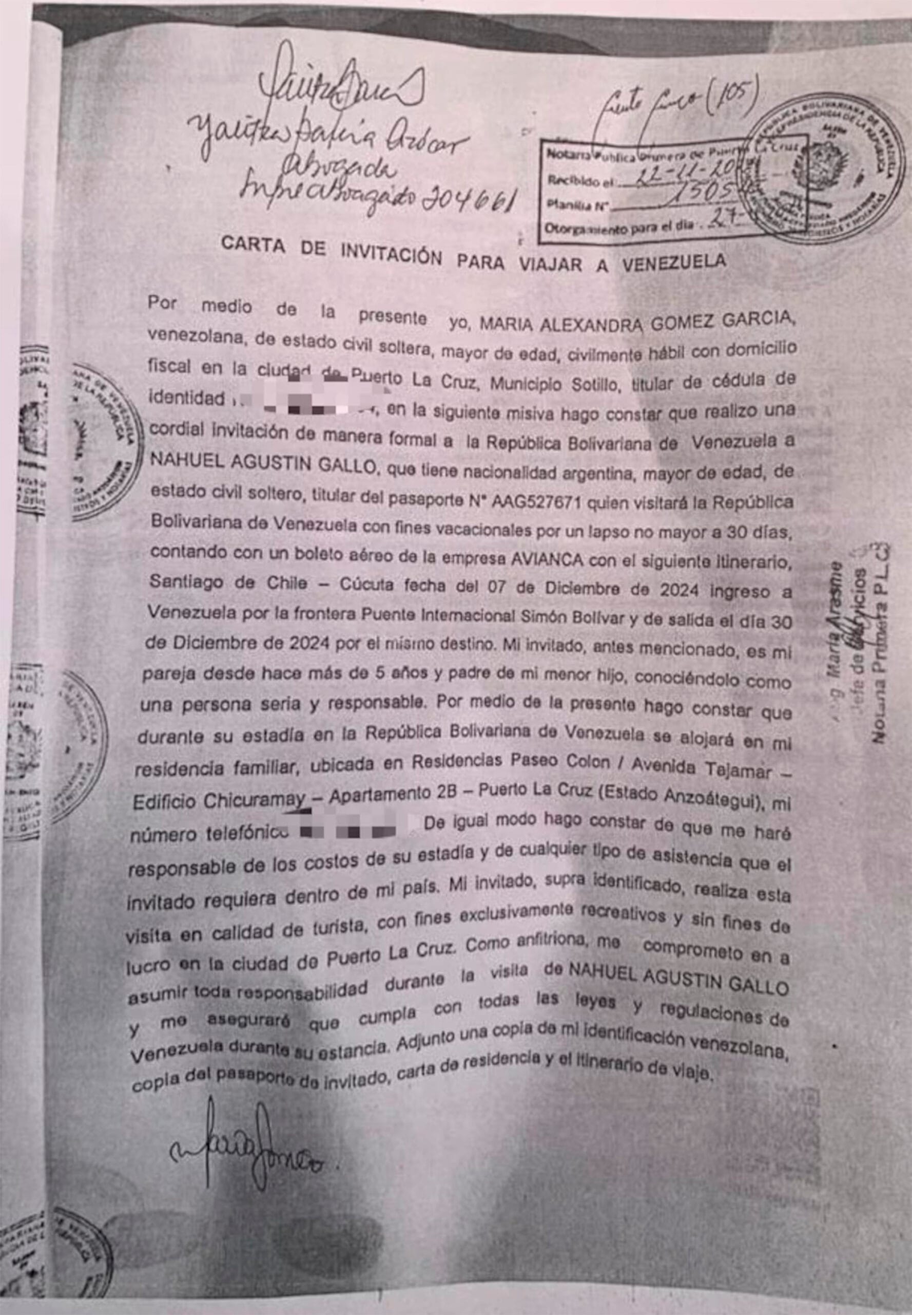 La circular enviada al Brasil agregó que el “ingreso a Venezuela por la frontera Puente Internacional Simón Bolívar y de salida el día 30 de diciembre de 2024 por el mismo destino”. Además, precisó que durante la estadía Gallo se iba a alojar en su casa.