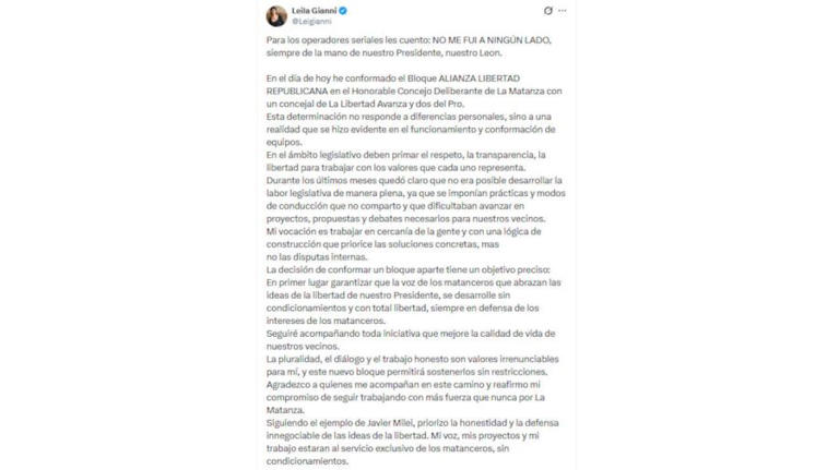 La flamante concejal publicó el 9 de diciembre un extenso texto en su cuenta oficial de X, hablando de su salida del bloque libertario: “Para los operadores seriales les cuento: NO ME FUI A NINGÚN LADO, siempre de la mano de nuestro Presidente, nuestro León. En el día de hoy he conformado el Bloque ALIANZA LIBERTAD REPUBLICANA en el Honorable Concejo Deliberante de La Matanza con un concejal de La Libertad Avanza y dos del Pro. Esta determinación no responde a diferencias personales, sino a una realidad que se hizo evidente en el funcionamiento y conformación de equipos”.