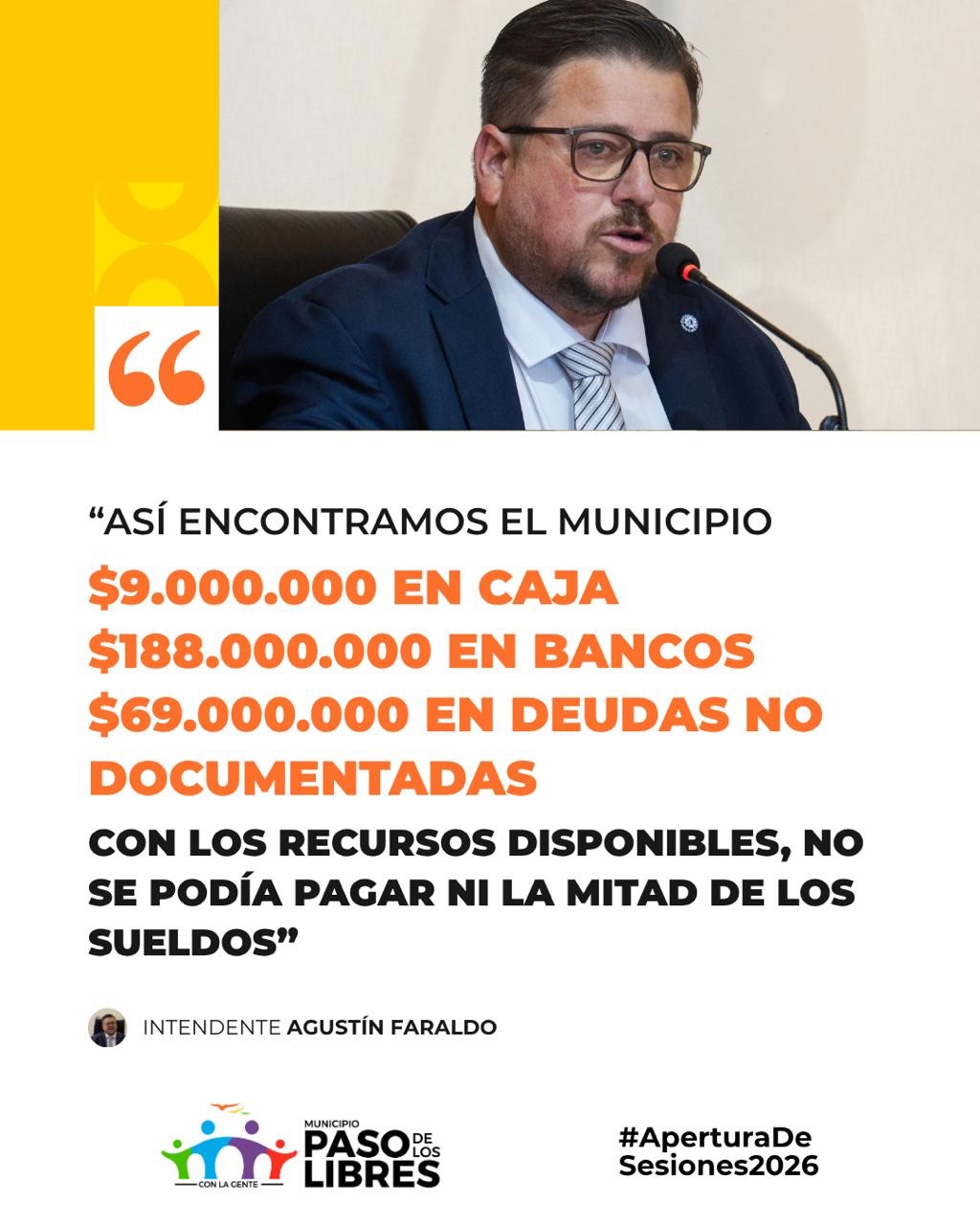Les contaré sobre la realidad económica y en general: un saldo en caja de $9.000.000 más un saldo en bancos de $188.000.000. Y deudas no documentadas de compromisos asumidos anteriormente por $69.000.000. Pero quiero decir algo con total claridad: recibimos un municipio con números comprometidos, que no estaba en condiciones de sostenerse.