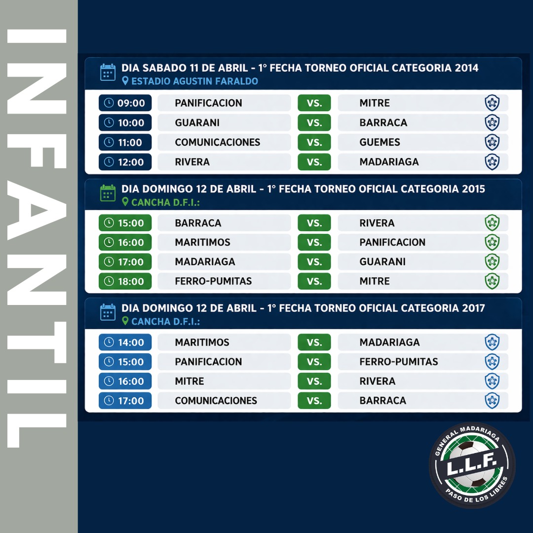 Desde el sábado 11/4, comenzarán a disputarse los torneos de las categorías 2014, en el estadio “Agustín Faraldo”, y los encuentros de las categorías 2015 y 2017 en el predio del Departamento de Fútbol Infantil (DFI).