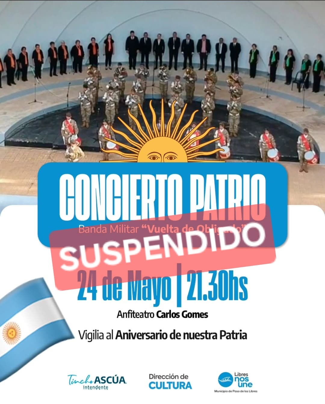 El Municipio de Paso de los Libres informa a la comunidad que, debido a las inclemencias climáticas, determinó la suspensión del Concierto Patrio que estaba previsto para hoy en el anfiteatro “Carlos Gomes”.