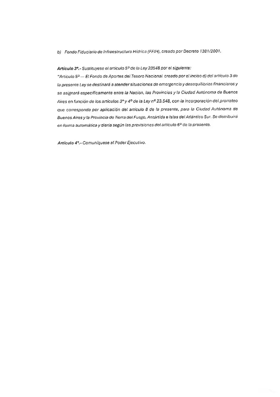 “El Fondo de Aportes del Tesoro Nacional creado por el inciso d) del artículo 3 de la presente Ley se destinará a atender situaciones de emergencia y desequilibrios financieros y se asignará específicamente entre la Nación, las Provincias y la Ciudad Autónoma de Buenos Aires, en función de los artículos 30 y 40 de la Ley n° 23.548, con la incorporación del prorrateo que corresponda por aplicación del artículo 8 de la presente. Para la Ciudad Autónoma de Buenos Aires y la Provincia de Tierra del Fuego, Antártida e Islas del Atlántico Sur se distribuirá en forma automática y diaria según las previsiones del artículo 60 de la presente.