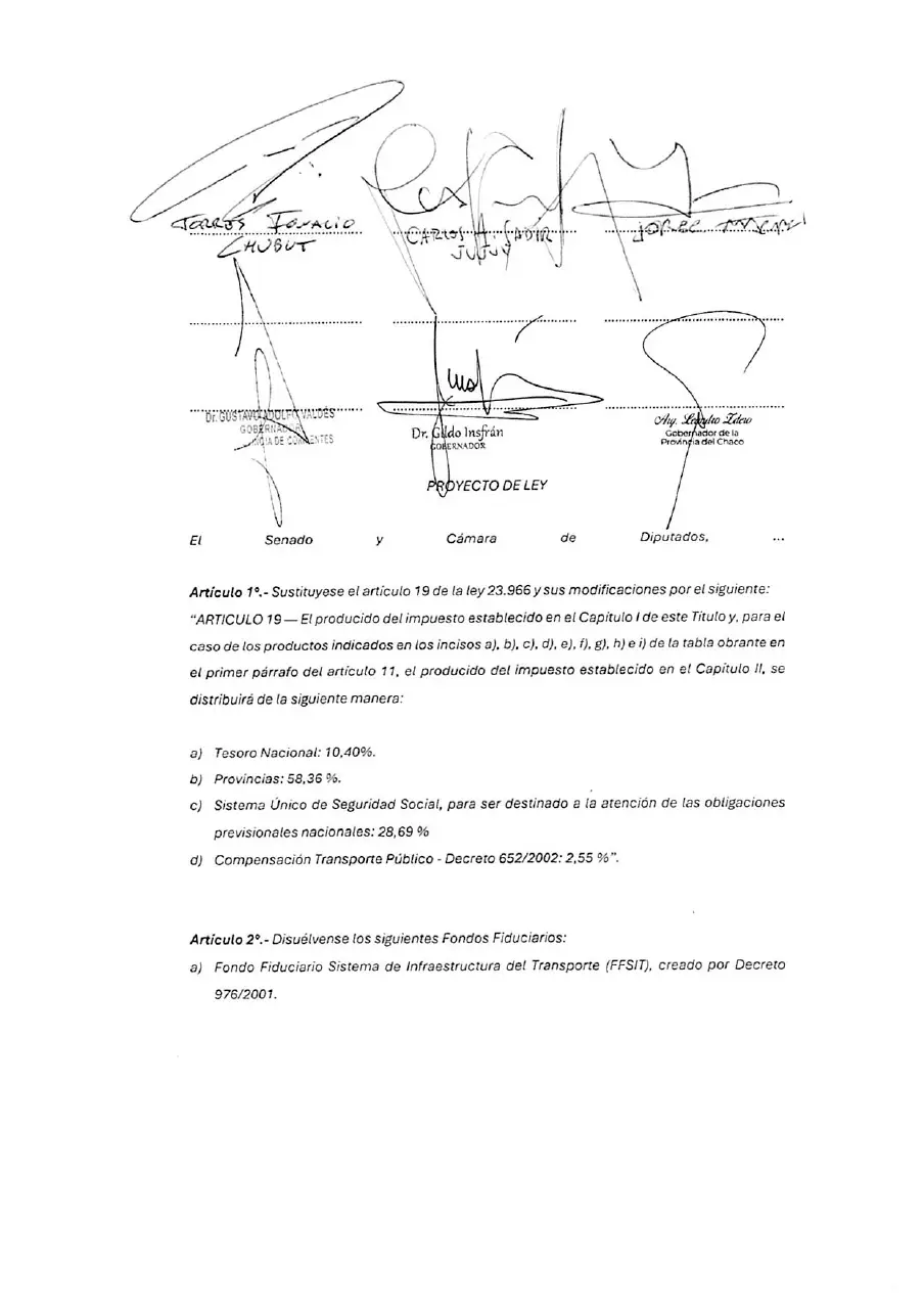 “Los abajo firmantes, Gobernadores de las provincias y Jefe de Gobierno de la Ciudad Autónoma de Buenos Aires, proponemos un Proyecto de Ley mediante el cual se decide la eliminación de todas los fondos fiduciarios que se financian con el Impuesto a los Combustibles Líquidos (Ley 23.966) para que tanto Nación como las 24 jurisdicciones puedan destinar esos fondos según las prioridades que cada uno defina”, señala el documento de los mandatarios provinciales.